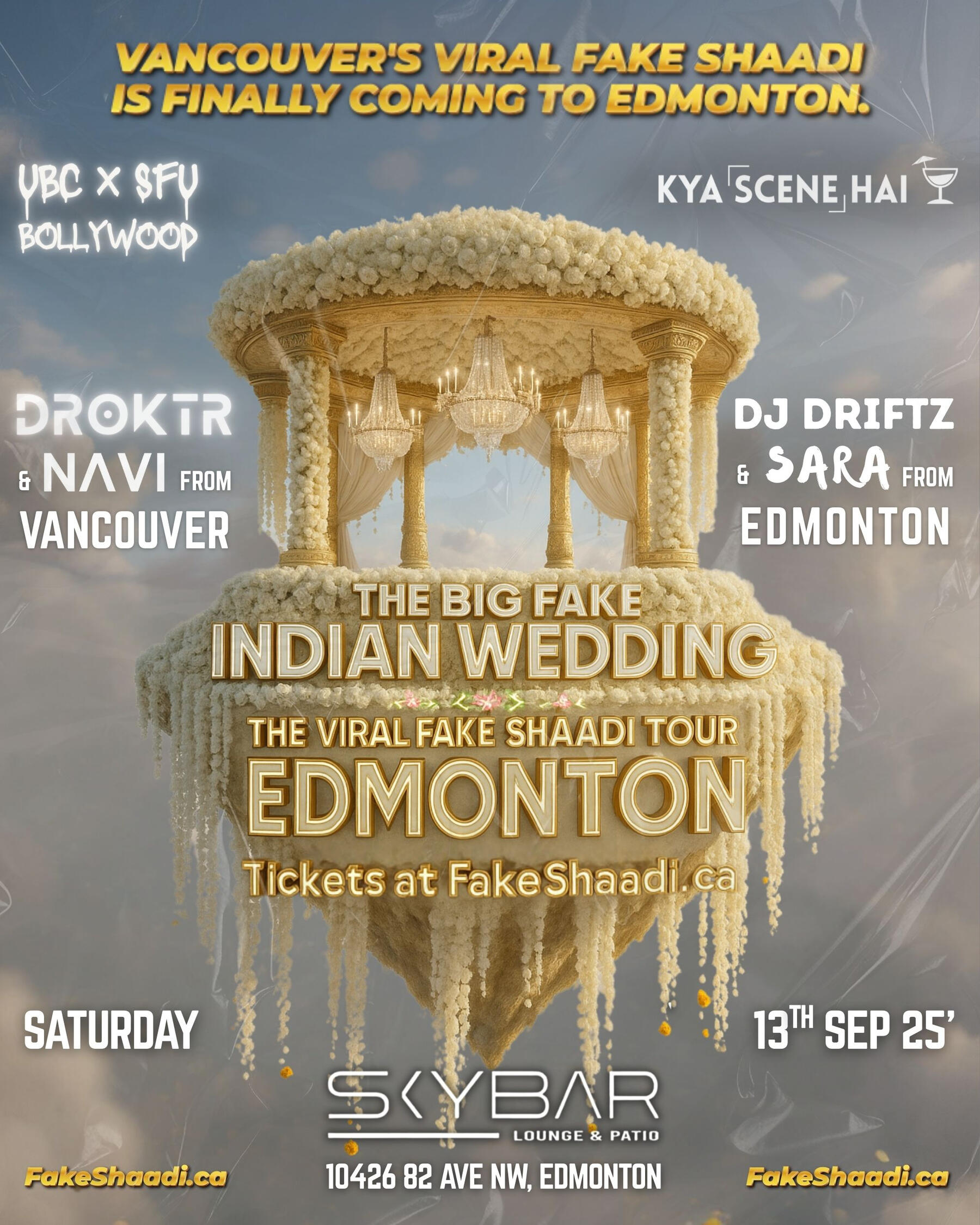 After back-to-back SOLD-OUT chaos with FAKE SANGEET and THE BIG FAKE INDIAN WEDDING in Vancouver… we’re hitting the road.This is FAKE SHAADI: WESTERN CANADA TOUR 2025 — one fake bride, one fake groom, and thousands of real Bollywood lovers ready to party like it’s a cousin’s wedding on steroids.Expect dhol, dance-offs, free mehndi & mithai, wild baraat entrances, and that “only at a shaadi” kind of energy… but bigger, louder, and city after city.⭐ PARTNERING POWER ⭐